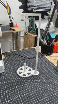 We also have a separte spool holder for the large spools available in Hackspace. This primarily works by the thread reeling off the spool, but there is little tension correction prior to the machine so there amy be issues with tension is using this.