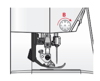 - Place the thread into the thread guide (A) from back to front to back. Pull the thread clockwise around the bobbin winder tension disc (B).