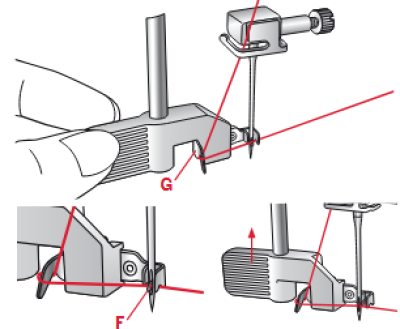 - Insert the new needle, using the multi-purpose tool. Push the new needle upwards with the flat side away from you until it will go no further.