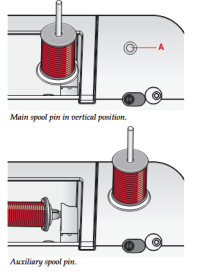 The machine has two spool pins, a main spool pin and an auxiliary spool pin. These are designed for many types of thread. The main spool pin is adjustable and can be used in both horizontal position ( the thread reels off the spool) and a vertical position ( the thread spool rotates. The horizontal position can be used for most sewing and embroidery thread and the vertical position can be used for many speciality thread.