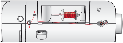 - Place the thread into the thread guide (A) from back to front to back. Pull the thread clockwise around the bobbin winder tension disc (B).