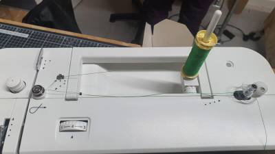 We also have a separte spool holder for the large spools available in Hackspace. This primarily works by the thread reeling off the spool, but there is little tension correction prior to the machine so there amy be issues with tension is using this.
