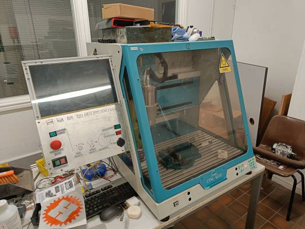 This CNC mill is a modified ICP 4030 CNC mill with a 2.2kW spindle that can spin up to 24,000 RPM. This is well suited for milling aluminium, plastics and other soft materials. It is possible to mill harder materials such as titanium too, if the depth of cut is kept very shallow.