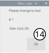 Once on this screen, select a tool number using the “T?” icon (12). This will bring up a dialog (13) to enter the tool number. The number you choose here is arbitrary, except for 0 which means no tool. When you click OK the machine will begin to move to the touch off position. If the selected tool number is different to your current tool then you will get the following pop-up: