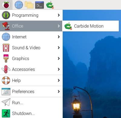Start Carbide Motion by clicking the raspberry button in the top left → Office → Carbide Motion