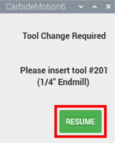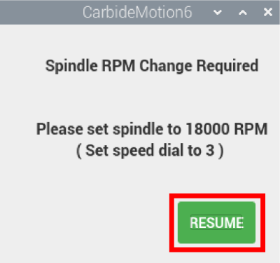 Spindle will spin up and there will be a message to set the speed dial. If the dial is correct just hit resume, if you need to change it open the door, the spindle will stop, set the speed, close the door and hit resume