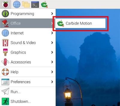 Start Carbide Motion by clicking the raspberry button in the top left → Office → Carbide Motion