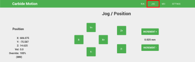 In Carbide Create press the Jog button in the top menu and using either the on screen pad or the pendant, move the router to the back of the enclosure.