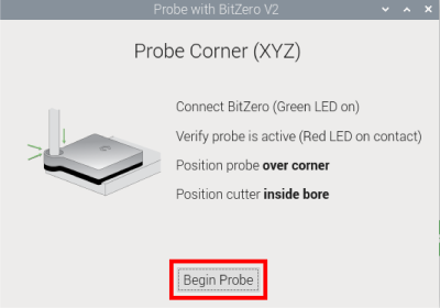 Move the router into the bottom left corner, attach the probe magnet and touch the probe to the probe plate and you should see a red light.